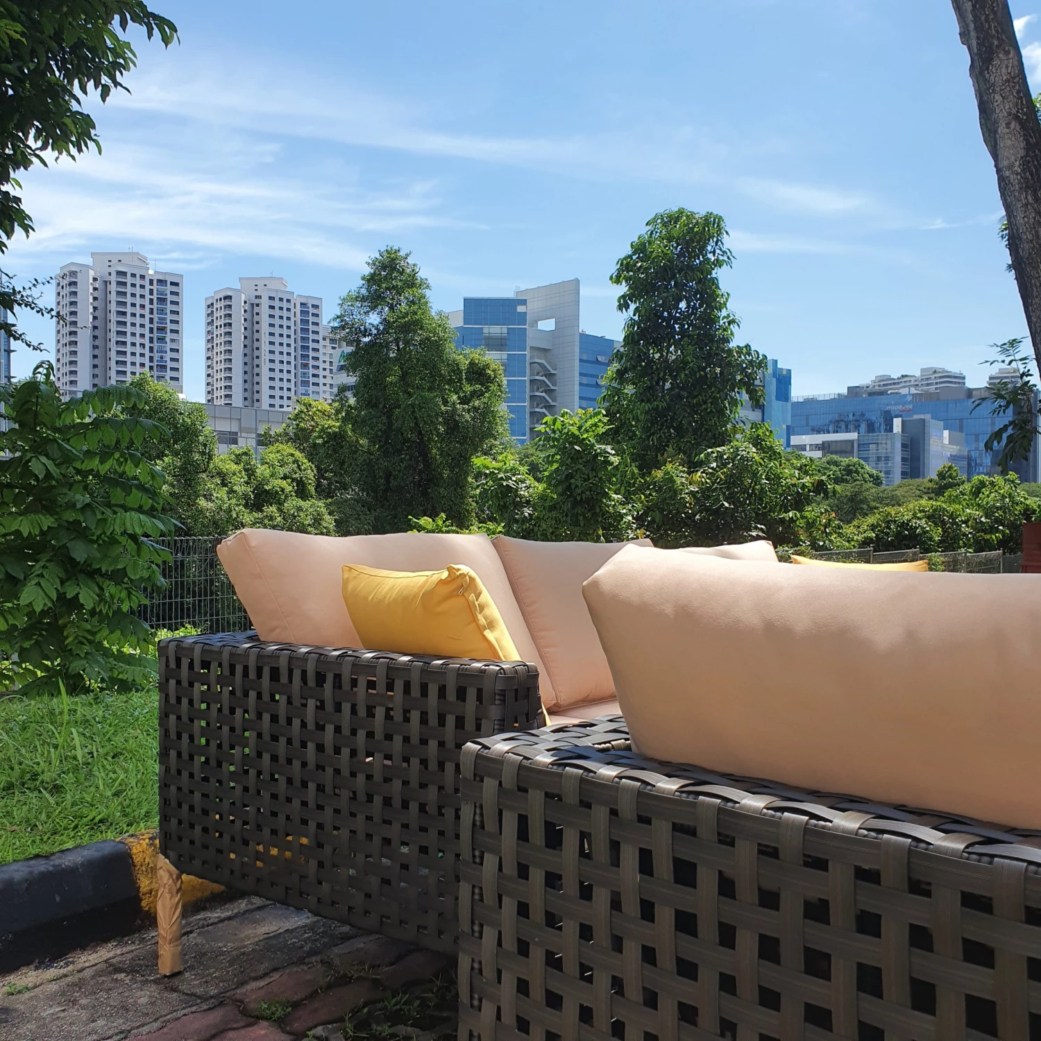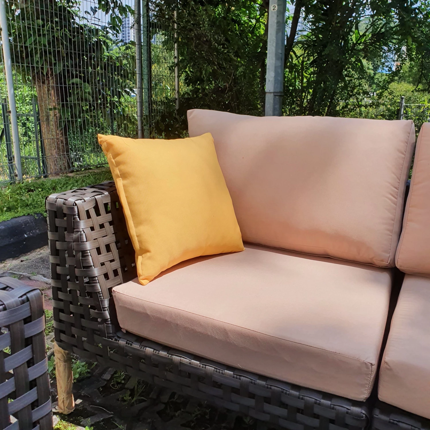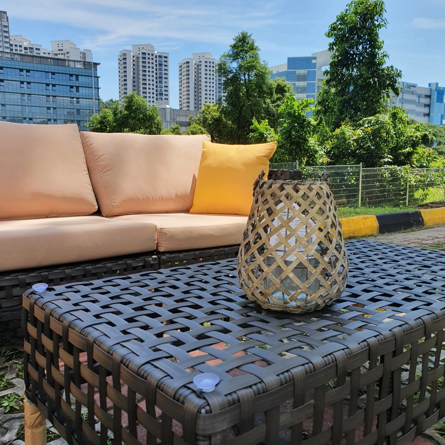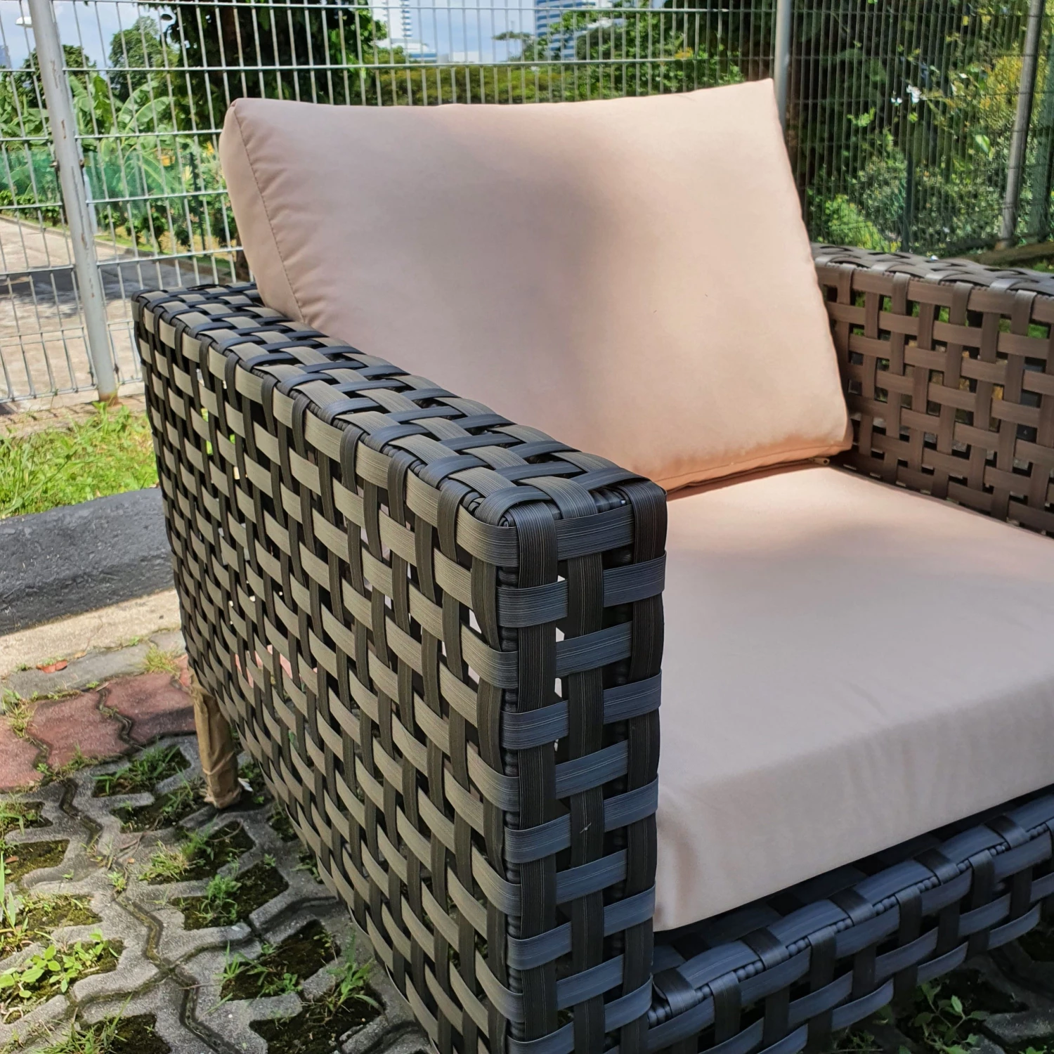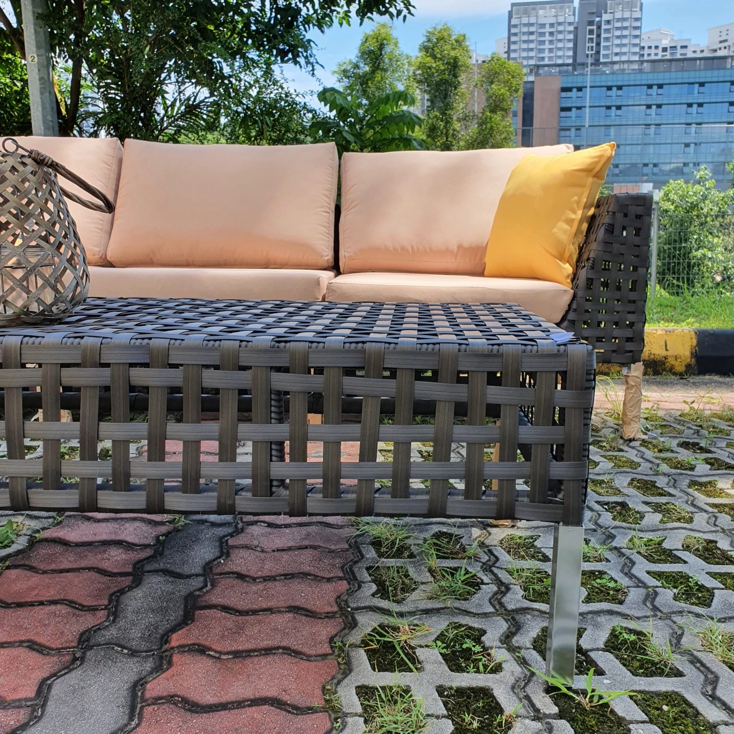 The outdoor knit is first sewn into tubes, stuffed with poly-fill then handwoven around the powder-coated cast aluminium frame.