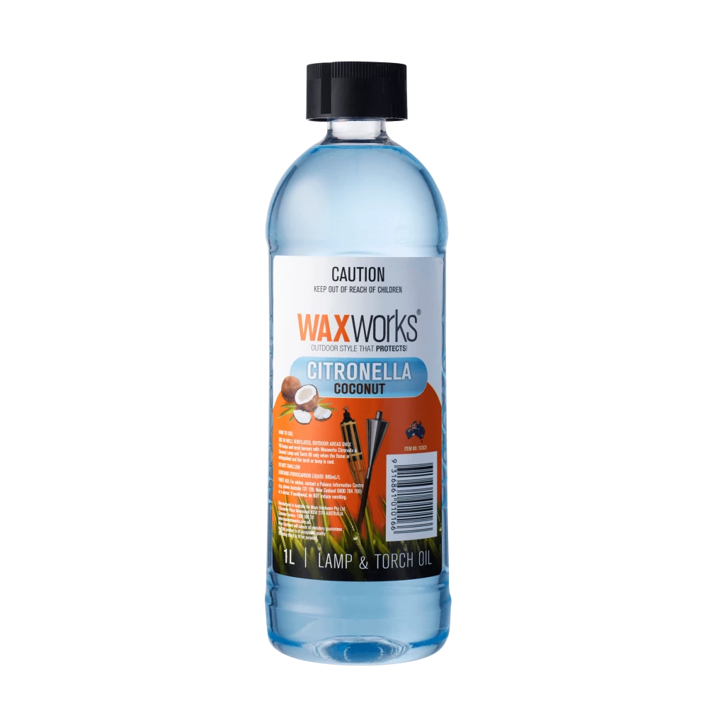 Active ingredient kills mosquitoes fast Contains Citronella oil with Coconut Ideal for use with Waxworks Table, Top Torches and Garden Torches. Made from quality materials for a cleaner burn, recommended for outdoor use only.