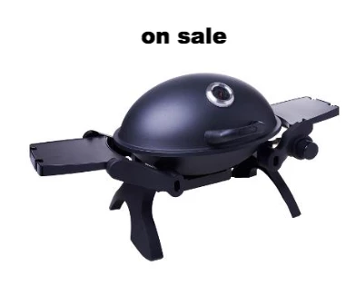 Balcony size outdoor portable gas grill with side wings. Cast iron grill grates, drip tray.