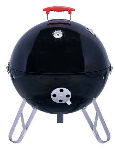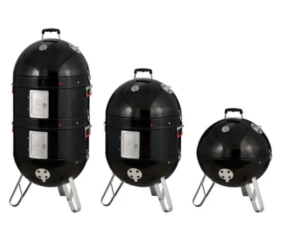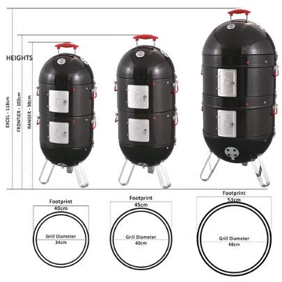 You can grill, roast or smoke food. It has thick walls for robustness and insulation, long lasting stainless steel grills, making it easy to clean. All the fittings (side handles, clips, nuts and bolts) are also stainless steel, making the smoker more resistant to rust. The side handles are PVC coated for a cooler touch, and the probe eyelets (fitted on each stacker) are made from silicon to protect your probe wires from damage, they fit a wide range of probe sizes. A fish/ meat hanger and temperature gauge are included. With it’s 65lbs cooking capacity, you can cook 8 whole chickens at a time. The smoker’s modular design makes it easy to increase capacity by adding an extra stacker. Use just the lid and base as a portable “kettle” BBQ, great for the beach. Folding side handles make it easy to store, or carry. The are 3 air vents in the base, allow for excellent temperature control. Assembled dimensions are 120 x 50 cm.