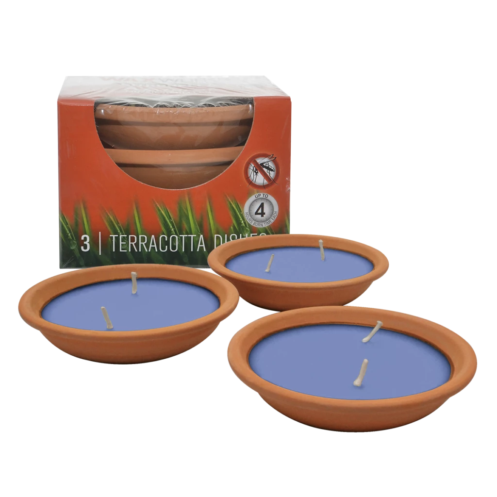 Citronella candles in Terrocotta Dishes make for a charming look whist giving protection against mozzies.