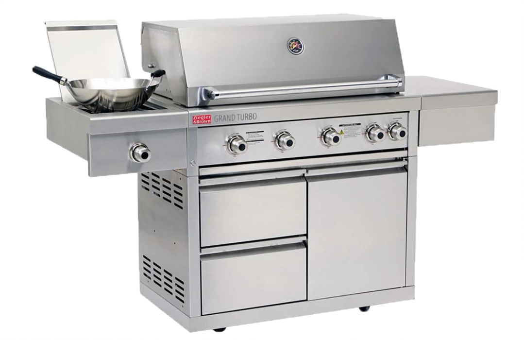 Optional sink and bench modules can be bolted to the right of the Grand Turbo BBQ.
